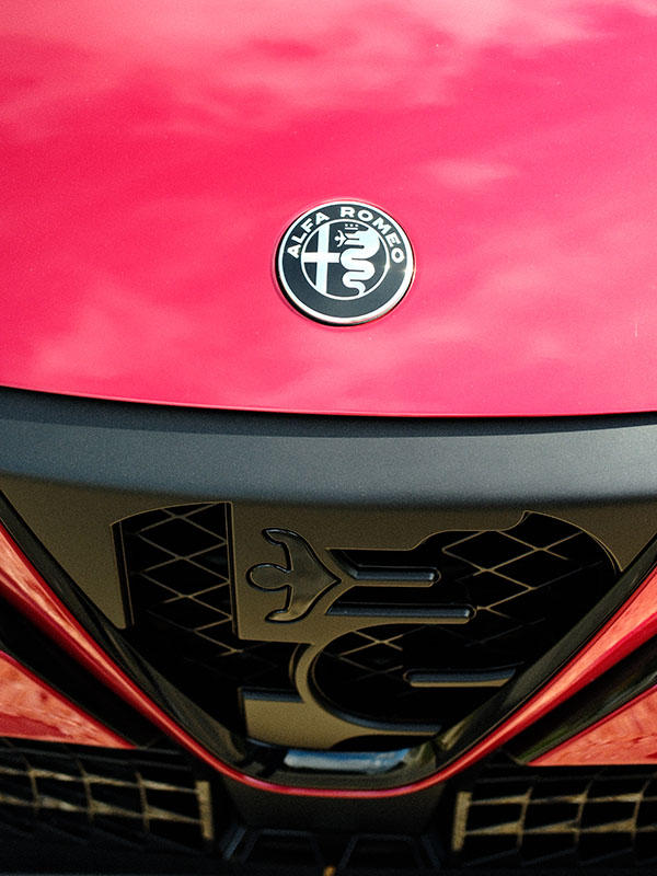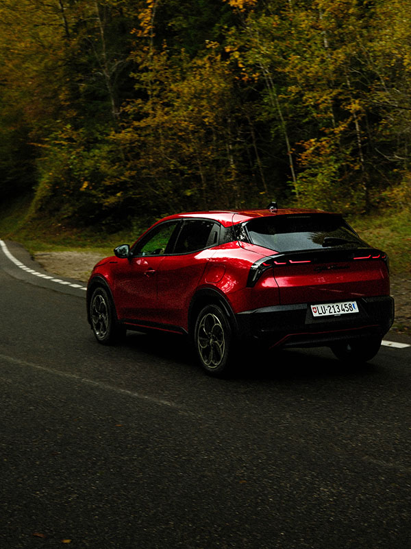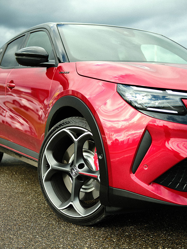 Widmen wir uns zum Schluss dem Aussendesign – gerade bei einem Alfa Romeo stets ein Schlüsselkriterium. Wie gefällt er, der erste rein elektrisch erhältliche Alfa? Das Design polarisiert mit seiner zerklüfteten Front mit wild geschnittenen Kerben, Lüftungsschlitzen und den grimmigen Scheinwerfern. Es sind die Zeichen der Zeit – ein sportlich ausgelegtes Modell kommt nicht ohne fiesen Blick aus. Hier folgt der Junior ganz dem geltenden Designmainstream, nimmt sich aber durch Anordnung der Elemente und vor allem dank des typischen Scudetto, wie der schildförmige Alfa-Kühlergrill genannt wird, doch eine gewisse Eigenständigkeit heraus. Der Scudetto ist gleichzeitig der Grund, warum das Auto in natura besser wirkt als auf Fotos. Dieser nimmt das Markenlogo mit dem Biscione, der grossen geschwundenen Schlange auf. Leider geht dieses wichtige Merkmal je nach Licht verloren, so dass der Scudetto als plumpe schwarze Fläche wahrgenommen wird.